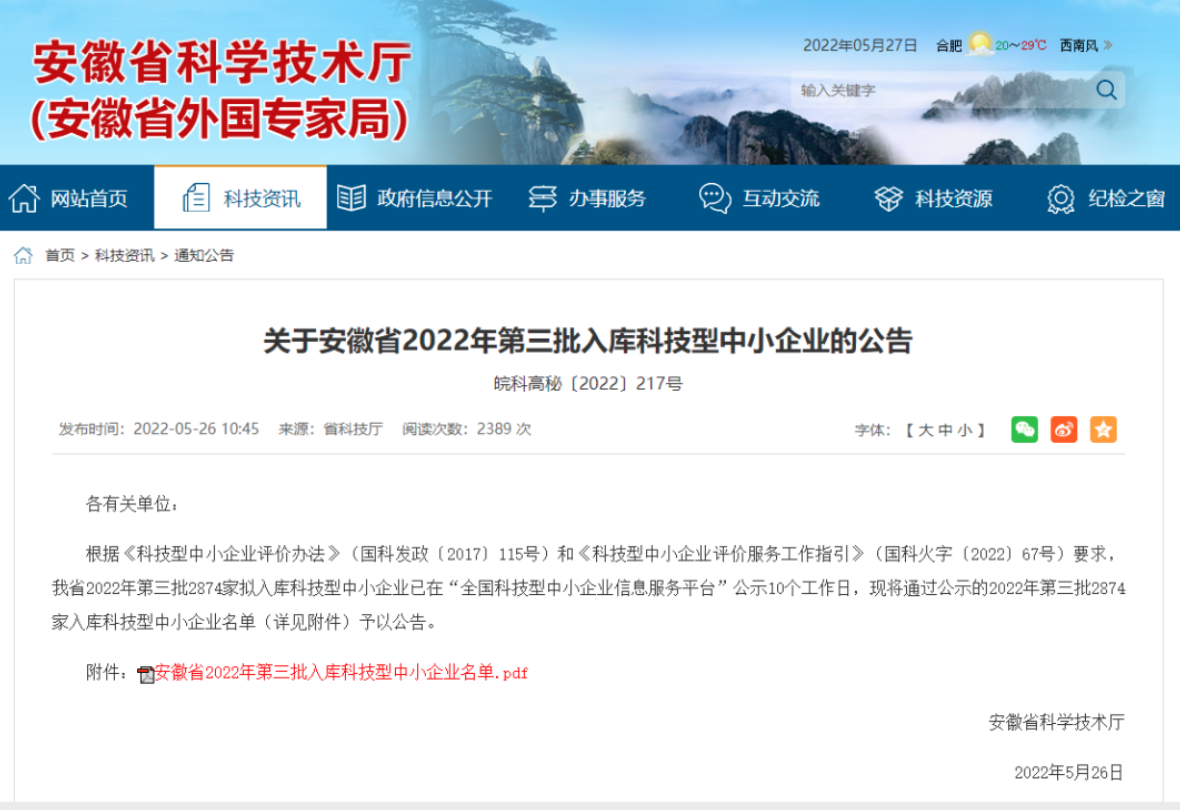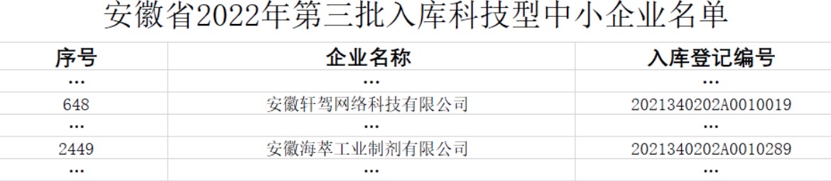 5月26日,安徽省科技廳公示了2022年第三批擬入庫科技型中小企業(yè)名單,園區(qū)安徽海萃工業(yè)制劑有限公司和安徽軒架網(wǎng)絡科技有限公司兩戶企業(yè)成功入庫。